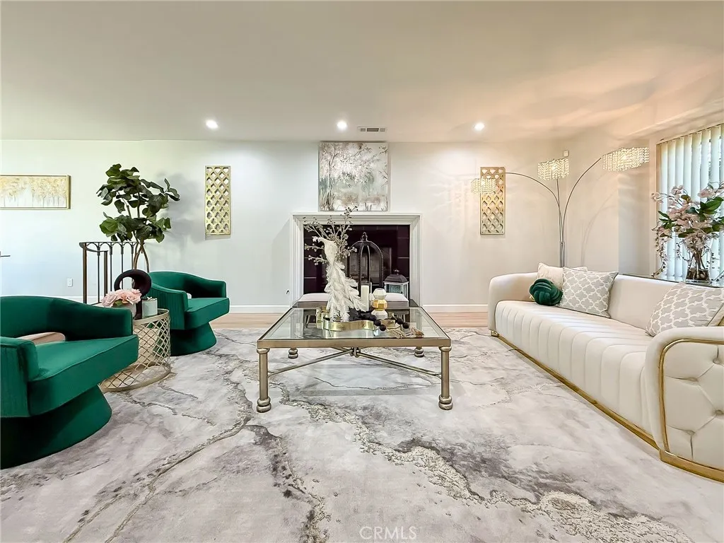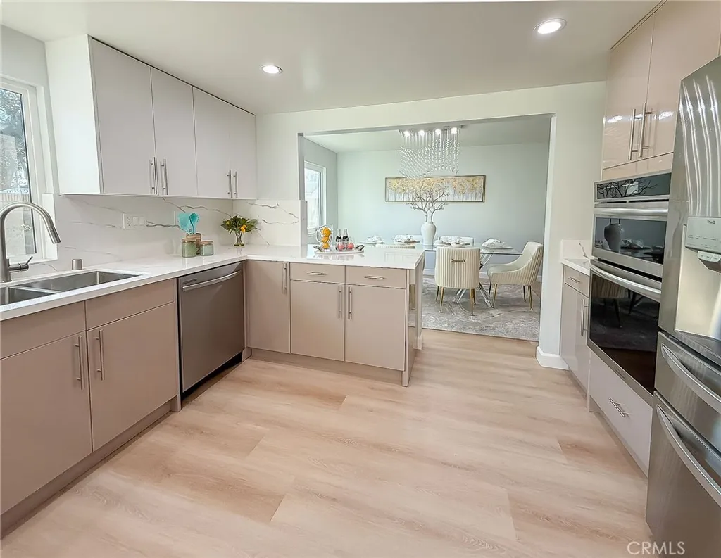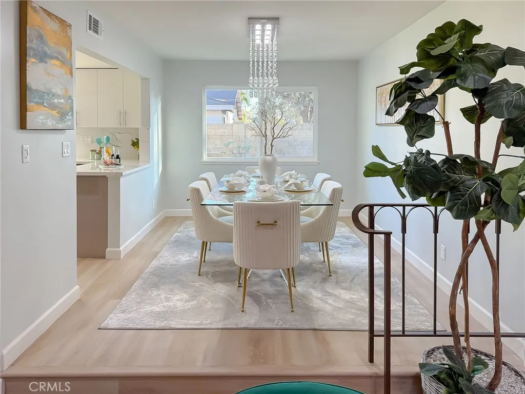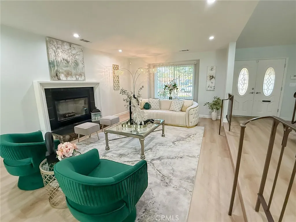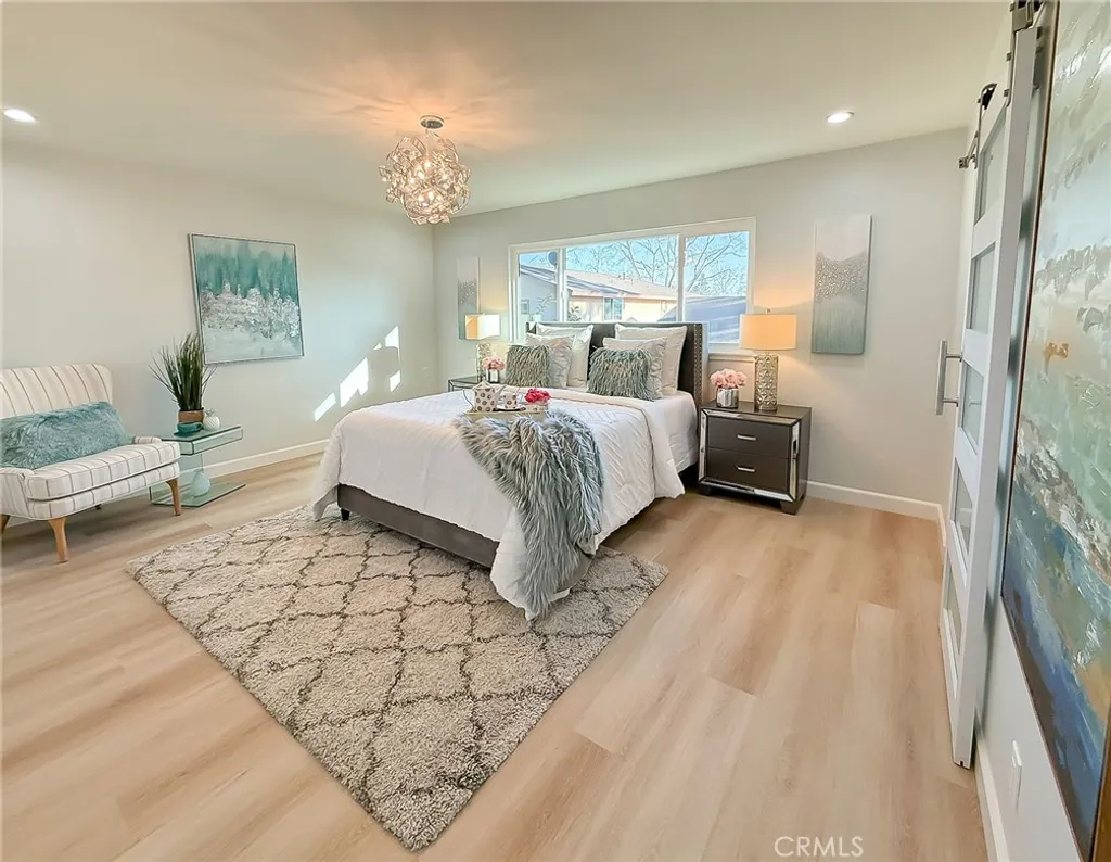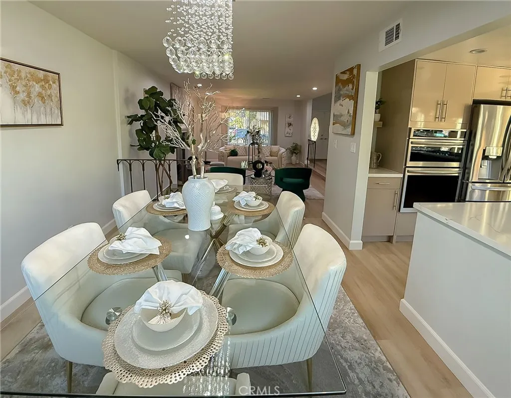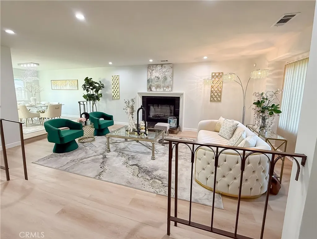 Wishes do come true with this exquisitely remodeled 5-bedroom, 3-bathroom, two-level corner-lot home. This stunning abode seamlessly blends elegance and comfort offering an impressive 2,326 sq.ft. of meticulously designed living space on a generous 5,694 sq.ft. lot with a bedroom and bath on the main floor. Upon arrival, you're greeted by an impressive double-door entrance leading to a living room with a romantic fireplace. The sophisticated ambiance is enhanced by beautiful neutral-color waterproof vinyl floors, recessed lighting and dual-pane windows throughout. The formal dining room, illuminated by an elegant wave-raindrop crystal chandelier, transforms every dining into a gourmet experience. Adjacent to the dining area, the bright kitchen boasts two oversized sliding glass doors opening to a manicured backyard. Equipped with generous modern European cabinets and quartz countertops, it also features stainless steel appliances with a 5-burner stove, touch control range hood, a built-in microwave and oven combination and a 4-door LG refrigerator with InstaView. The cozy family room, overlooking the backyard, provides the perfect space for family gatherings. Ascend the stairway, illuminated by a stunning hanging crystal chandelier, to the upper level, where four spacious bedrooms and two bathrooms await. The luxurious primary suite is a sanctuary, complete with a modern European floating vanity and a meticulously designed en-suite bathroom. The hallway bathroom is equally impressive, featuring dual sinks and a glass-enclosed shower. All bathrooms are adorned with frameless LED lighted wall vanity mirrors, adding a touch of modern sophistication. This exceptional home also features a 2-car attached garage with direct interior access designed with a gorgeous custom glass door that enhances the curb appeal. Conveniently located within the highly acclaimed ABC School District, it is in close proximity to popular restaurants, specialty shops and a short distance to the Cerritos Mall. Don t miss the opportunity to make this stunning Cerritos home your own and live the life you've always dreamed of.