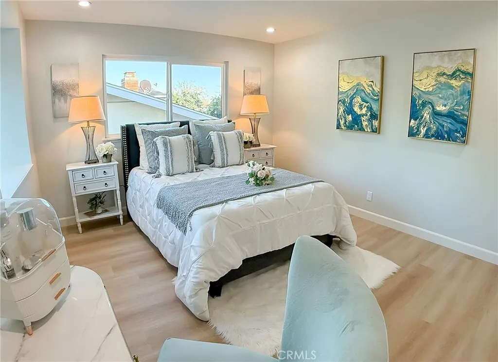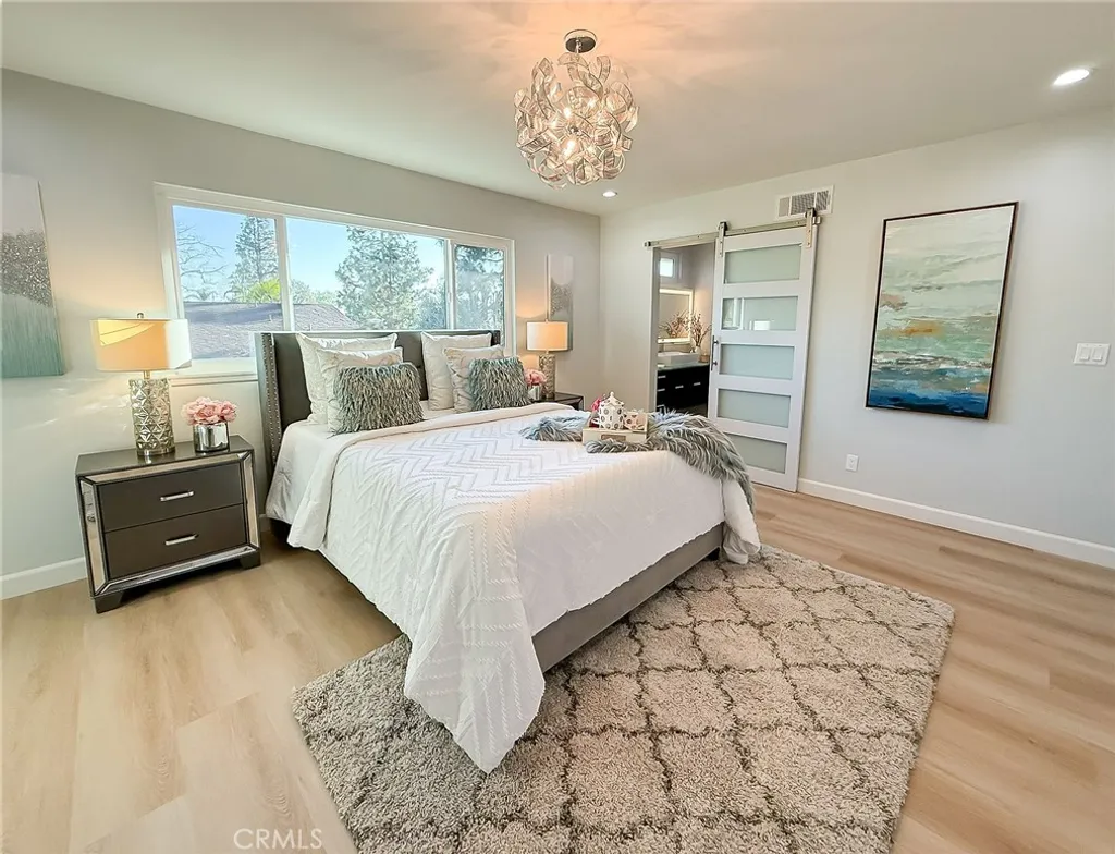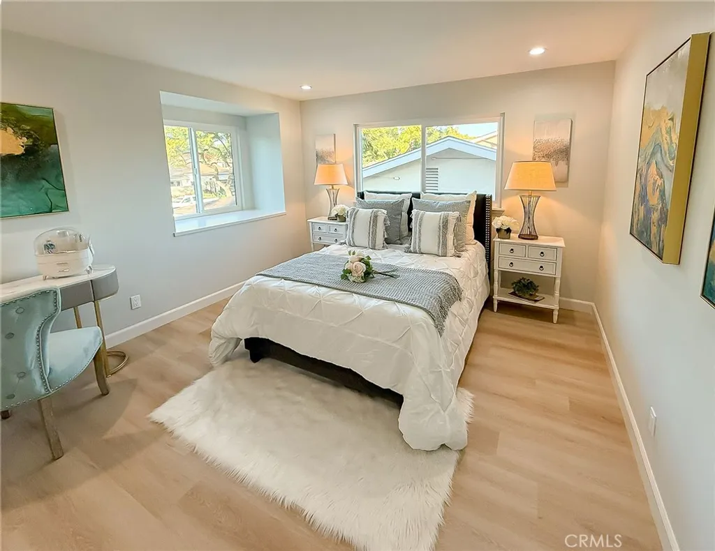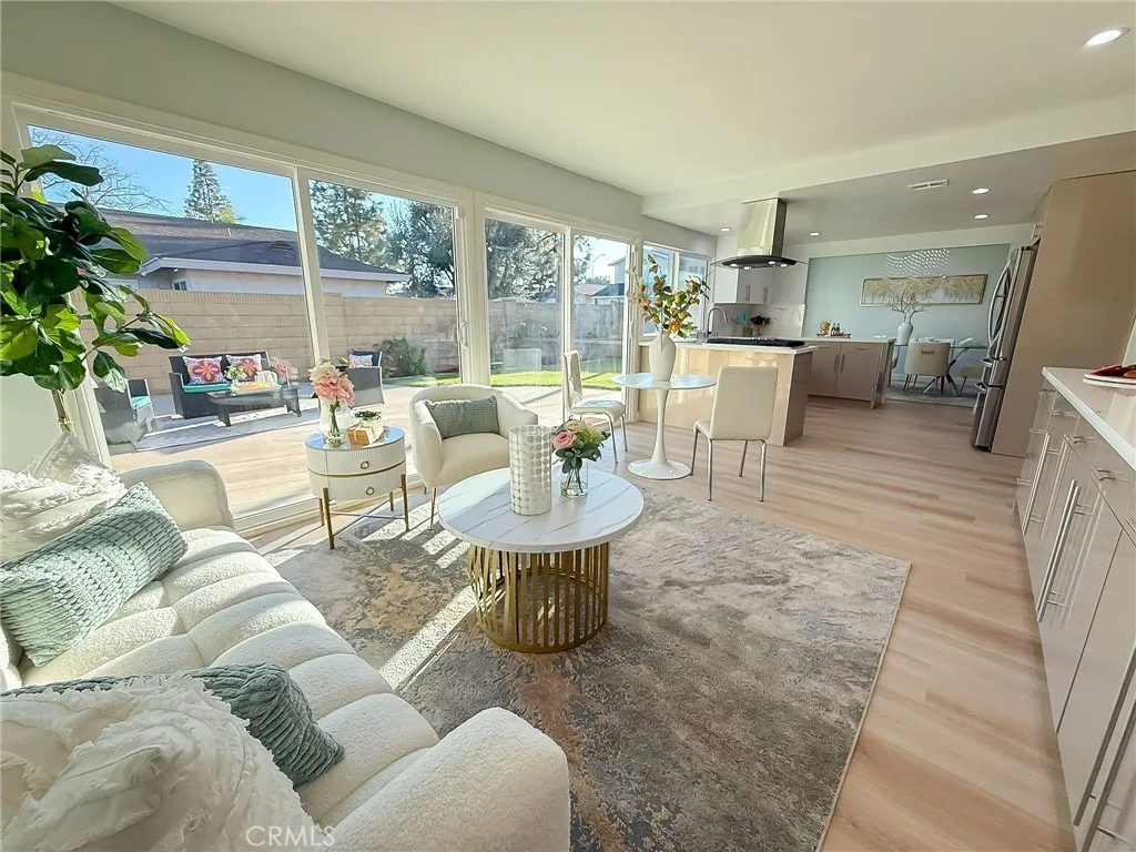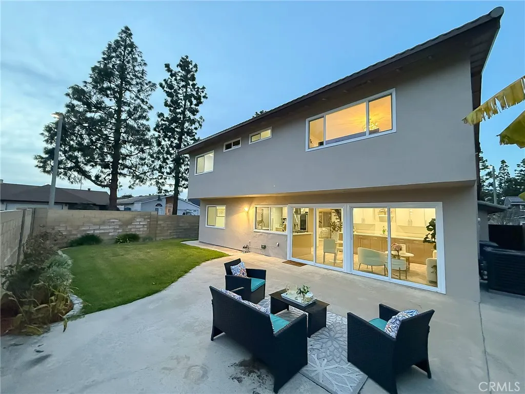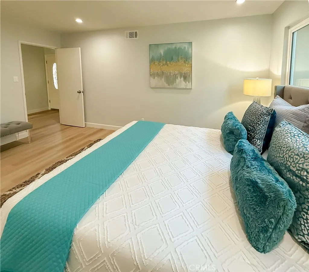 Wishes do come true with this exquisitely remodeled 5-bedroom, 3-bathroom, two-level corner-lot home. This stunning abode seamlessly blends elegance and comfort offering an impressive 2,326 sq.ft. of meticulously designed living space on a generous 5,694 sq.ft. lot with a bedroom and bath on the main floor. Upon arrival, you're greeted by an impressive double-door entrance leading to a living room with a romantic fireplace. The sophisticated ambiance is enhanced by beautiful neutral-color waterproof vinyl floors, recessed lighting and dual-pane windows throughout. The formal dining room, illuminated by an elegant wave-raindrop crystal chandelier, transforms every dining into a gourmet experience. Adjacent to the dining area, the bright kitchen boasts two oversized sliding glass doors opening to a manicured backyard. Equipped with generous modern European cabinets and quartz countertops, it also features stainless steel appliances with a 5-burner stove, touch control range hood, a built-in microwave and oven combination and a 4-door LG refrigerator with InstaView. The cozy family room, overlooking the backyard, provides the perfect space for family gatherings. Ascend the stairway, illuminated by a stunning hanging crystal chandelier, to the upper level, where four spacious bedrooms and two bathrooms await. The luxurious primary suite is a sanctuary, complete with a modern European floating vanity and a meticulously designed en-suite bathroom. The hallway bathroom is equally impressive, featuring dual sinks and a glass-enclosed shower. All bathrooms are adorned with frameless LED lighted wall vanity mirrors, adding a touch of modern sophistication. This exceptional home also features a 2-car attached garage with direct interior access designed with a gorgeous custom glass door that enhances the curb appeal. Conveniently located within the highly acclaimed ABC School District, it is in close proximity to popular restaurants, specialty shops and a short distance to the Cerritos Mall. Don t miss the opportunity to make this stunning Cerritos home your own and live the life you've always dreamed of.