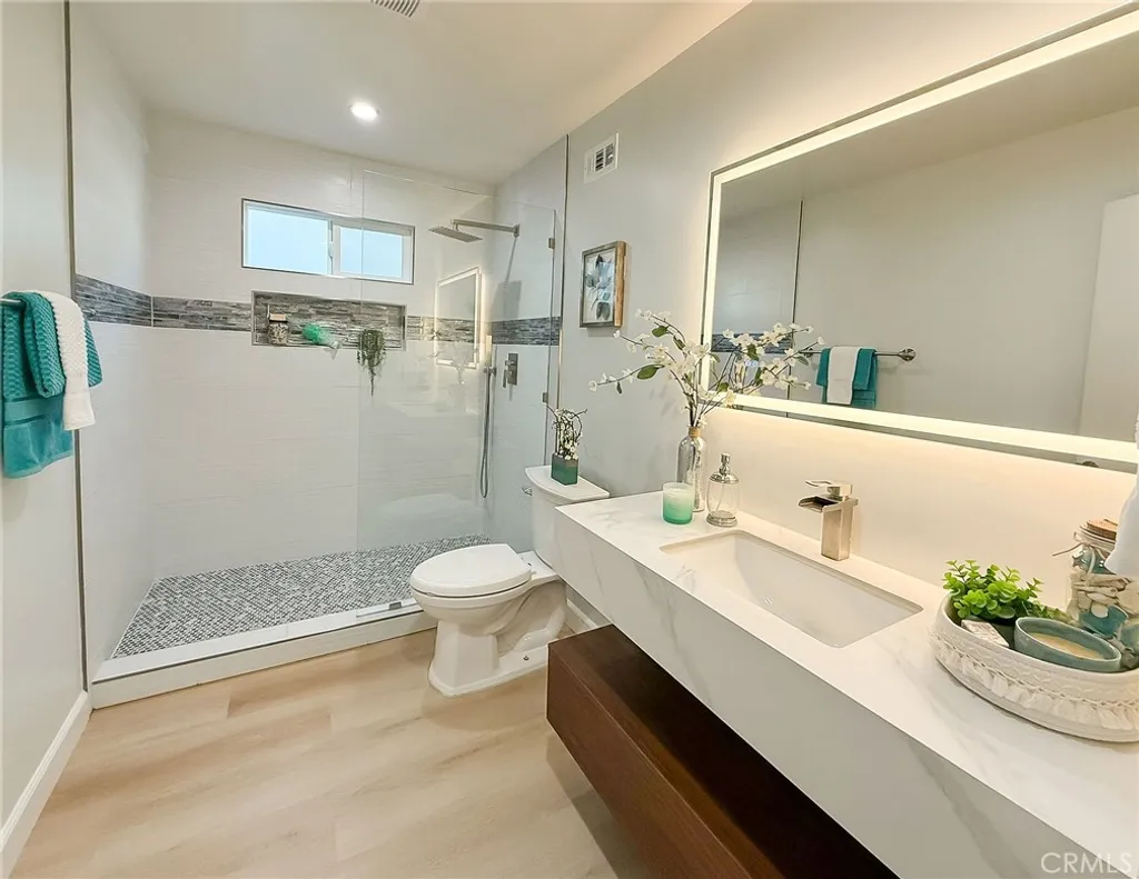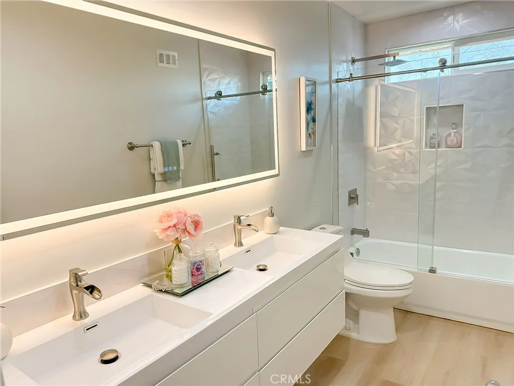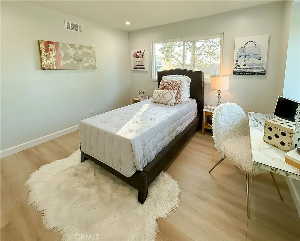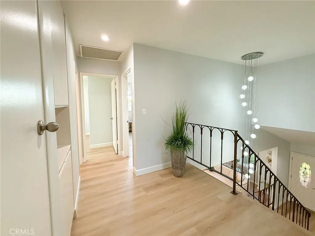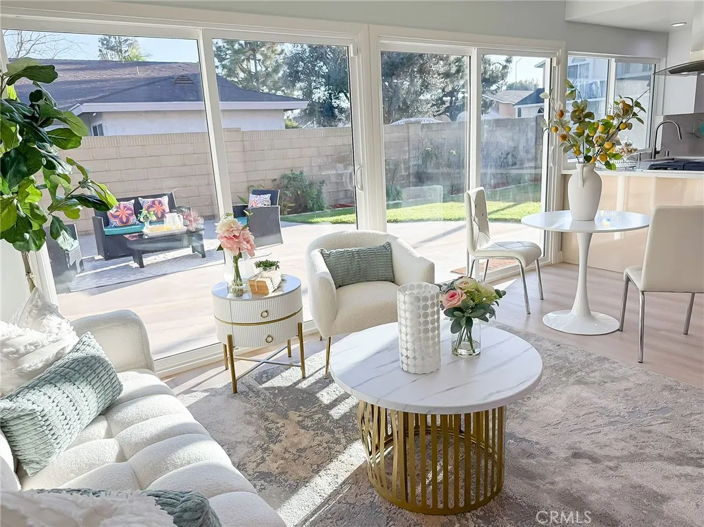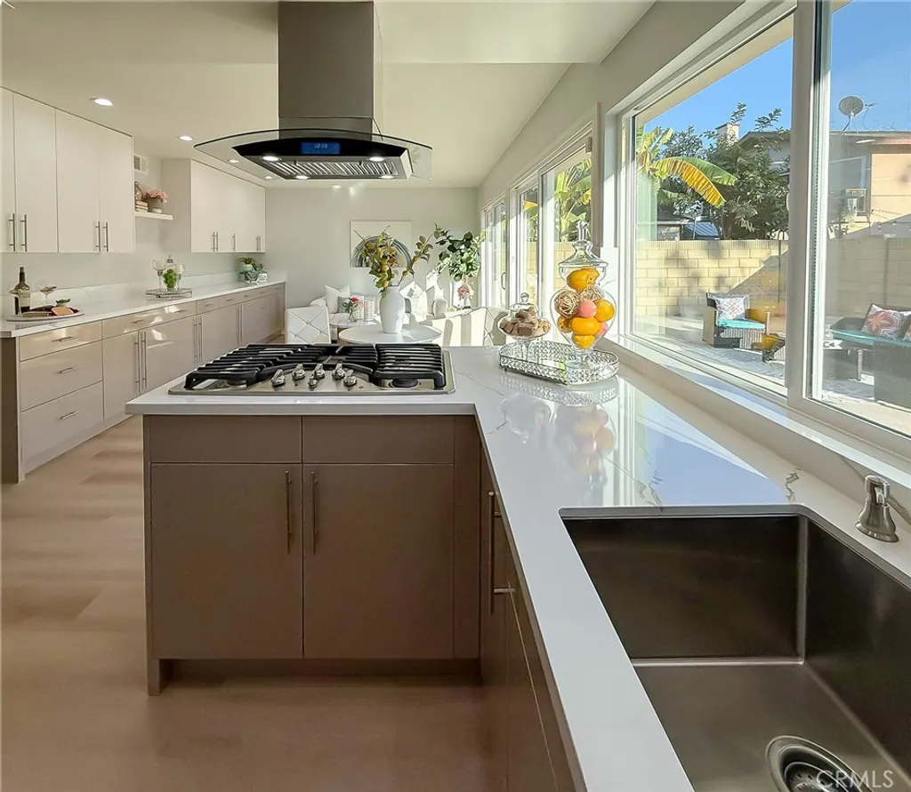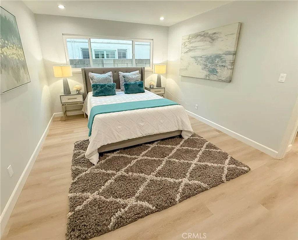 Wishes do come true with this exquisitely remodeled 5-bedroom, 3-bathroom, two-level corner-lot home. This stunning abode seamlessly blends elegance and comfort offering an impressive 2,326 sq.ft. of meticulously designed living space on a generous 5,694 sq.ft. lot with a bedroom and bath on the main floor. Upon arrival, you're greeted by an impressive double-door entrance leading to a living room with a romantic fireplace. The sophisticated ambiance is enhanced by beautiful neutral-color waterproof vinyl floors, recessed lighting and dual-pane windows throughout. The formal dining room, illuminated by an elegant wave-raindrop crystal chandelier, transforms every dining into a gourmet experience. Adjacent to the dining area, the bright kitchen boasts two oversized sliding glass doors opening to a manicured backyard. Equipped with generous modern European cabinets and quartz countertops, it also features stainless steel appliances with a 5-burner stove, touch control range hood, a built-in microwave and oven combination and a 4-door LG refrigerator with InstaView. The cozy family room, overlooking the backyard, provides the perfect space for family gatherings. Ascend the stairway, illuminated by a stunning hanging crystal chandelier, to the upper level, where four spacious bedrooms and two bathrooms await. The luxurious primary suite is a sanctuary, complete with a modern European floating vanity and a meticulously designed en-suite bathroom. The hallway bathroom is equally impressive, featuring dual sinks and a glass-enclosed shower. All bathrooms are adorned with frameless LED lighted wall vanity mirrors, adding a touch of modern sophistication. This exceptional home also features a 2-car attached garage with direct interior access designed with a gorgeous custom glass door that enhances the curb appeal. Conveniently located within the highly acclaimed ABC School District, it is in close proximity to popular restaurants, specialty shops and a short distance to the Cerritos Mall. Don t miss the opportunity to make this stunning Cerritos home your own and live the life you've always dreamed of.