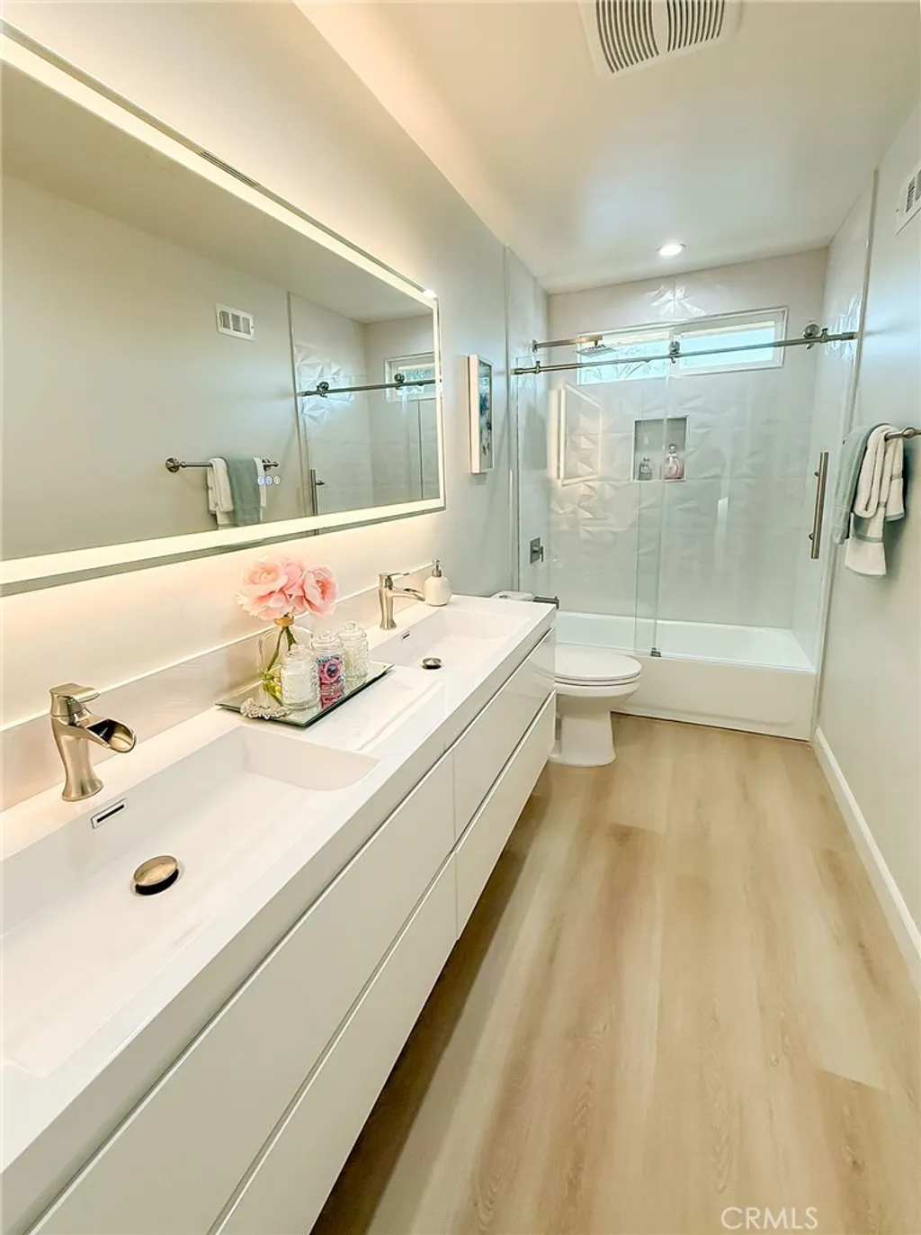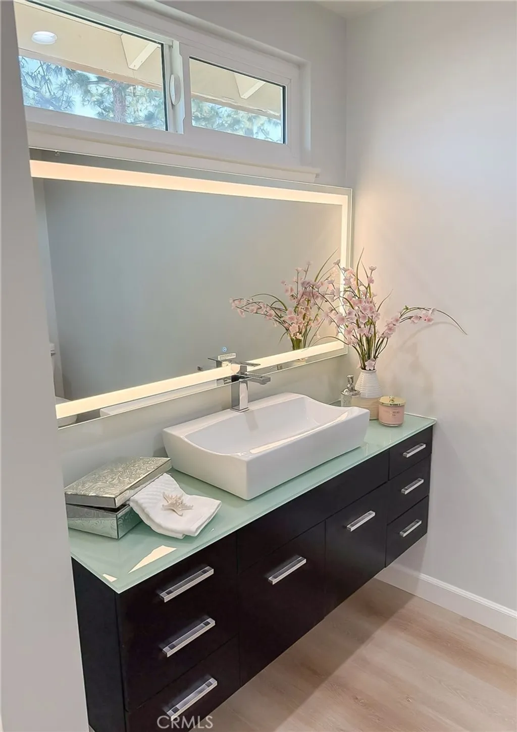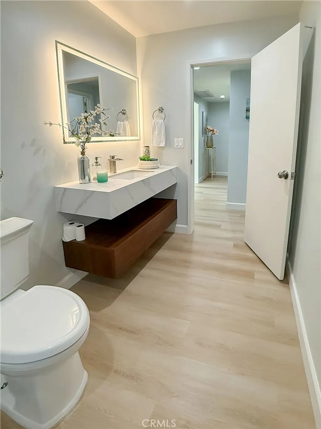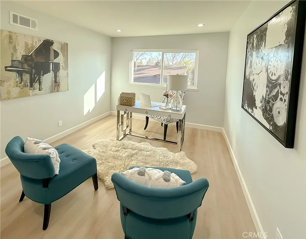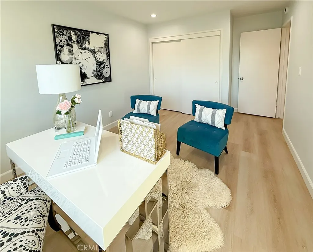 Wishes do come true with this exquisitely remodeled 5-bedroom, 3-bathroom, two-level corner-lot home. This stunning abode seamlessly blends elegance and comfort offering an impressive 2,326 sq.ft. of meticulously designed living space on a generous 5,694 sq.ft. lot with a bedroom and bath on the main floor. Upon arrival, you're greeted by an impressive double-door entrance leading to a living room with a romantic fireplace. The sophisticated ambiance is enhanced by beautiful neutral-color waterproof vinyl floors, recessed lighting and dual-pane windows throughout. The formal dining room, illuminated by an elegant wave-raindrop crystal chandelier, transforms every dining into a gourmet experience. Adjacent to the dining area, the bright kitchen boasts two oversized sliding glass doors opening to a manicured backyard. Equipped with generous modern European cabinets and quartz countertops, it also features stainless steel appliances with a 5-burner stove, touch control range hood, a built-in microwave and oven combination and a 4-door LG refrigerator with InstaView. The cozy family room, overlooking the backyard, provides the perfect space for family gatherings. Ascend the stairway, illuminated by a stunning hanging crystal chandelier, to the upper level, where four spacious bedrooms and two bathrooms await. The luxurious primary suite is a sanctuary, complete with a modern European floating vanity and a meticulously designed en-suite bathroom. The hallway bathroom is equally impressive, featuring dual sinks and a glass-enclosed shower. All bathrooms are adorned with frameless LED lighted wall vanity mirrors, adding a touch of modern sophistication. This exceptional home also features a 2-car attached garage with direct interior access designed with a gorgeous custom glass door that enhances the curb appeal. Conveniently located within the highly acclaimed ABC School District, it is in close proximity to popular restaurants, specialty shops and a short distance to the Cerritos Mall. Don t miss the opportunity to make this stunning Cerritos home your own and live the life you've always dreamed of.