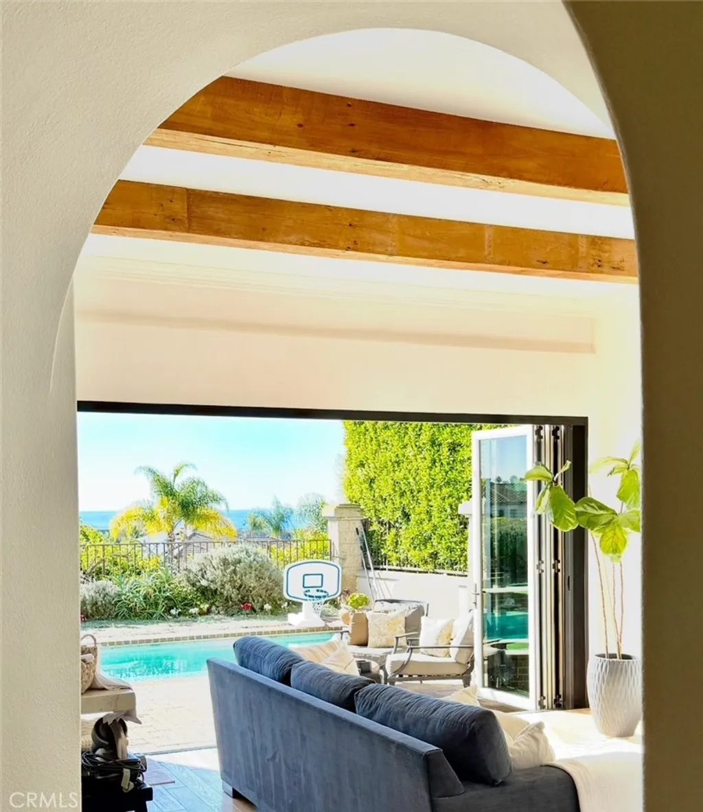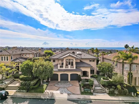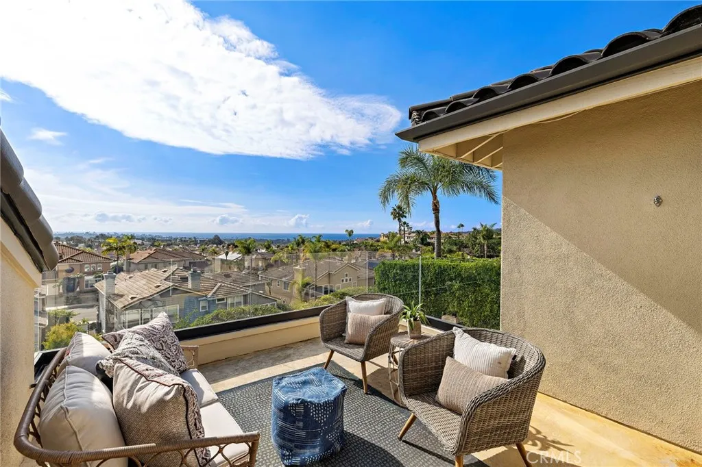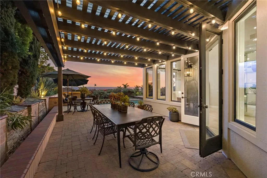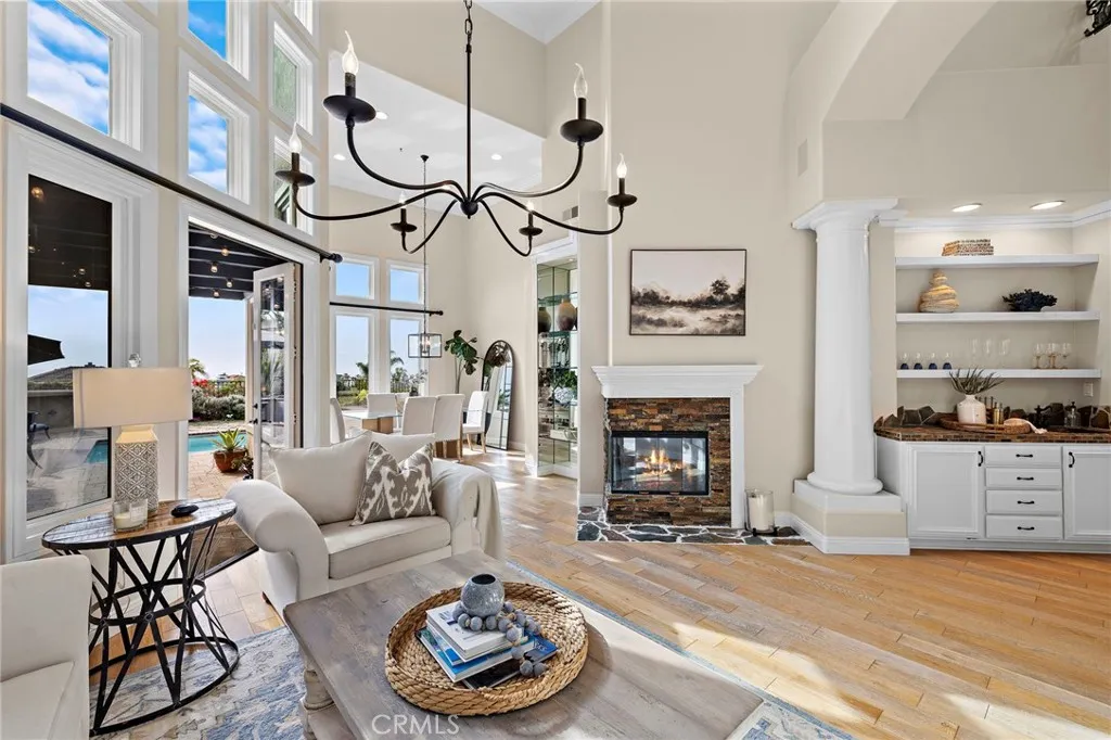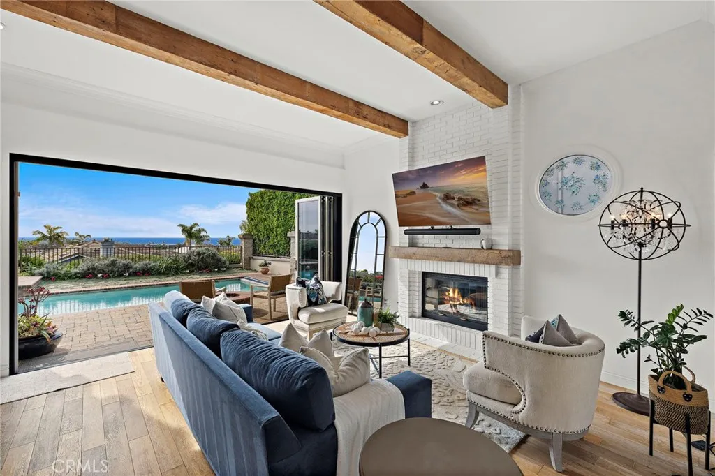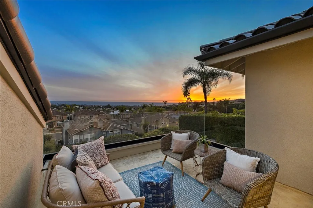 Positioned behind the gates of Ocean Ranch, this coastal residence captures EXPANSIVE OCEAN & SUNSET VIEWS (photos do not do justice) from Both First and Second Floors. Stone flooring introduces the entry, transitioning to vintage oak floors that continue throughout both levels of the home. The kitchen features custom cabinetry, Mont Blanc leathered quartzite countertops, reclaimed wood shelving, and a generous island. High-end appliances include double Bosch dishwashers, Bosch double ovens, a Dacor induction cooktop and refrigerator, wine storage, and a walk-in pantry. The kitchen opens to both the family room and a large adjacent breakfast nook, featuring an expansive picture window with glass-to-glass panel connections that frame the ocean view. The family room is anchored by a fireplace, reclaimed ceiling wood beams, and LaCantina bifold doors, creating an indoor-outdoor connection. The main level also includes a guest bedroom with en-suite bath, built-out library or home office, formal living and dining rooms, a powder bath with Venetian plaster, and a well-equipped laundry room with utility sink and laundry chute. Upstairs, the primary suite enjoys elevated ocean and San Clemente Island views and shares a double-sided fireplace with an adjacent office or retreat. The office/retreat features French doors that open to a sizable deck with spectacular ocean views. The primary bath includes a soaking tub, walk-in shower, imported Italian tile, dual vanities, and 2-spacious walk-in closets with custom organizers. Two additional guest bedrooms each offer en-suite baths. The backyard is designed for both entertaining and everyday enjoyment, with a saltwater pool and spa, waterfall feature, fire pit, built-in BBQ, separate bar, outdoor shower, and an inviting pergola with integrated lighting. Mature landscaping and ocean breezes complete the setting. Additional features include paid for solar panels, epoxy-coated plumbing, a low-water irrigation system. Ideally located near the harbor, beaches, and award-winning schools.