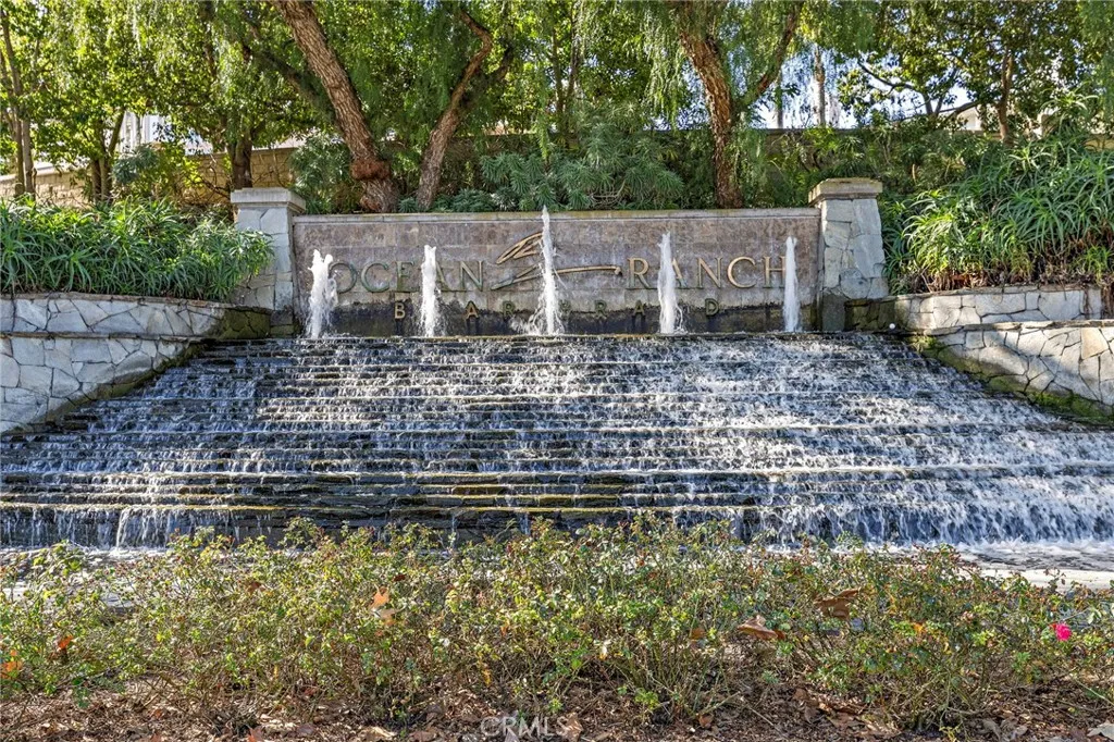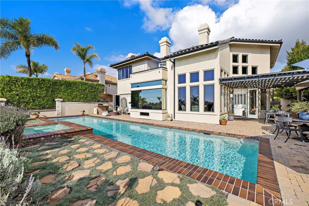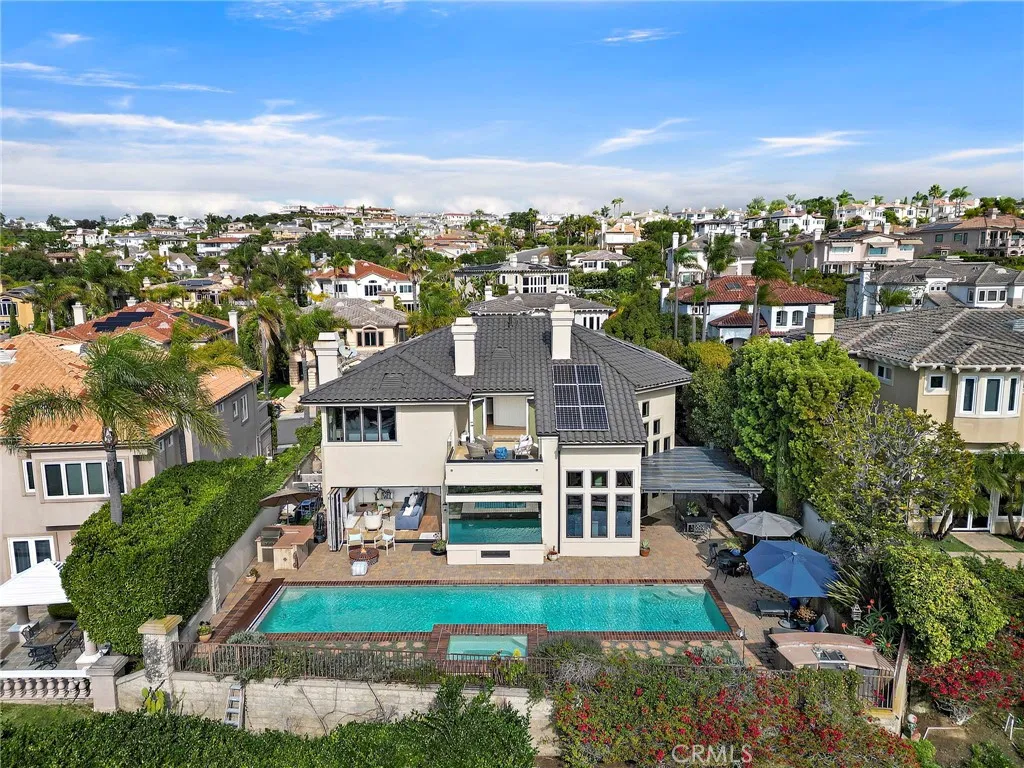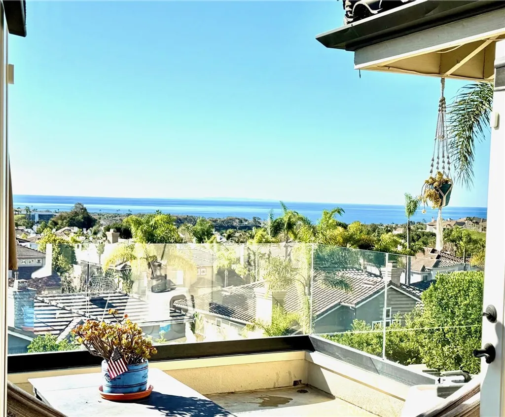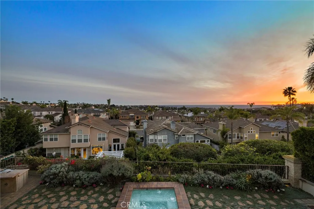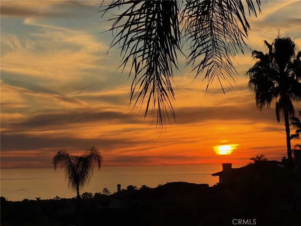 Positioned behind the gates of Ocean Ranch, this coastal residence captures EXPANSIVE OCEAN & SUNSET VIEWS (photos do not do justice) from Both First and Second Floors. Stone flooring introduces the entry, transitioning to vintage oak floors that continue throughout both levels of the home. The kitchen features custom cabinetry, Mont Blanc leathered quartzite countertops, reclaimed wood shelving, and a generous island. High-end appliances include double Bosch dishwashers, Bosch double ovens, a Dacor induction cooktop and refrigerator, wine storage, and a walk-in pantry. The kitchen opens to both the family room and a large adjacent breakfast nook, featuring an expansive picture window with glass-to-glass panel connections that frame the ocean view. The family room is anchored by a fireplace, reclaimed ceiling wood beams, and LaCantina bifold doors, creating an indoor-outdoor connection. The main level also includes a guest bedroom with en-suite bath, built-out library or home office, formal living and dining rooms, a powder bath with Venetian plaster, and a well-equipped laundry room with utility sink and laundry chute. Upstairs, the primary suite enjoys elevated ocean and San Clemente Island views and shares a double-sided fireplace with an adjacent office or retreat. The office/retreat features French doors that open to a sizable deck with spectacular ocean views. The primary bath includes a soaking tub, walk-in shower, imported Italian tile, dual vanities, and 2-spacious walk-in closets with custom organizers. Two additional guest bedrooms each offer en-suite baths. The backyard is designed for both entertaining and everyday enjoyment, with a saltwater pool and spa, waterfall feature, fire pit, built-in BBQ, separate bar, outdoor shower, and an inviting pergola with integrated lighting. Mature landscaping and ocean breezes complete the setting. Additional features include paid for solar panels, epoxy-coated plumbing, a low-water irrigation system. Ideally located near the harbor, beaches, and award-winning schools.