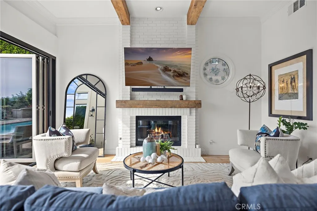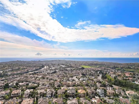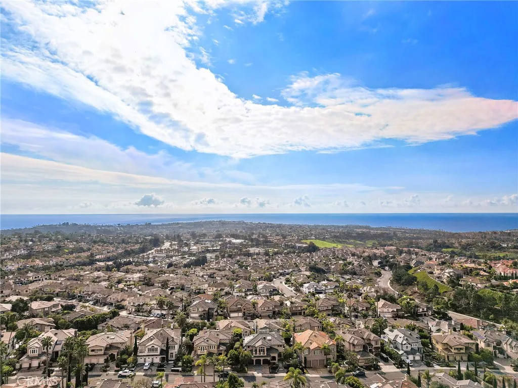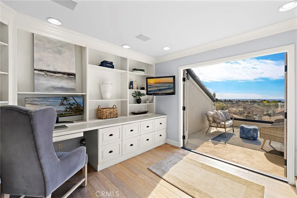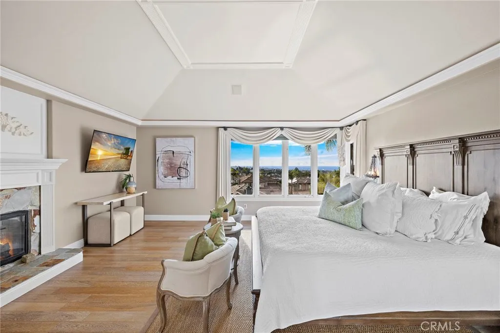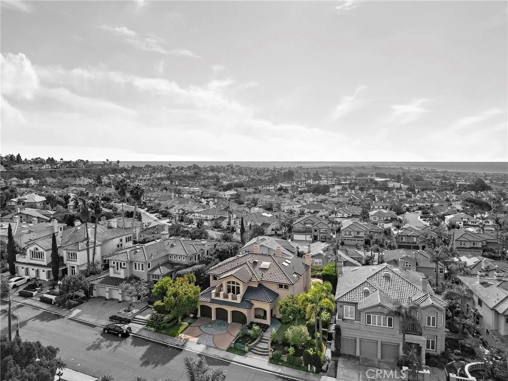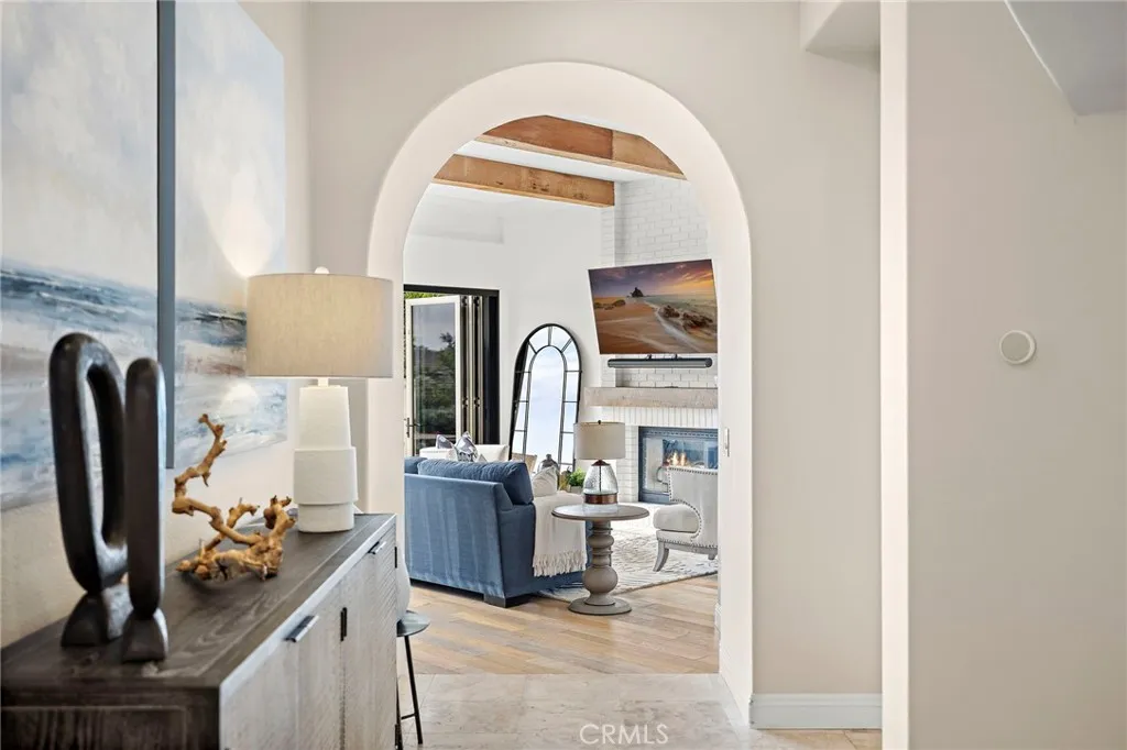 Positioned behind the gates of Ocean Ranch, this coastal residence captures EXPANSIVE OCEAN & SUNSET VIEWS (photos do not do justice) from Both First and Second Floors. Stone flooring introduces the entry, transitioning to vintage oak floors that continue throughout both levels of the home. The kitchen features custom cabinetry, Mont Blanc leathered quartzite countertops, reclaimed wood shelving, and a generous island. High-end appliances include double Bosch dishwashers, Bosch double ovens, a Dacor induction cooktop and refrigerator, wine storage, and a walk-in pantry. The kitchen opens to both the family room and a large adjacent breakfast nook, featuring an expansive picture window with glass-to-glass panel connections that frame the ocean view. The family room is anchored by a fireplace, reclaimed ceiling wood beams, and LaCantina bifold doors, creating an indoor-outdoor connection. The main level also includes a guest bedroom with en-suite bath, built-out library or home office, formal living and dining rooms, a powder bath with Venetian plaster, and a well-equipped laundry room with utility sink and laundry chute. Upstairs, the primary suite enjoys elevated ocean and San Clemente Island views and shares a double-sided fireplace with an adjacent office or retreat. The office/retreat features French doors that open to a sizable deck with spectacular ocean views. The primary bath includes a soaking tub, walk-in shower, imported Italian tile, dual vanities, and 2-spacious walk-in closets with custom organizers. Two additional guest bedrooms each offer en-suite baths. The backyard is designed for both entertaining and everyday enjoyment, with a saltwater pool and spa, waterfall feature, fire pit, built-in BBQ, separate bar, outdoor shower, and an inviting pergola with integrated lighting. Mature landscaping and ocean breezes complete the setting. Additional features include paid for solar panels, epoxy-coated plumbing, a low-water irrigation system. Ideally located near the harbor, beaches, and award-winning schools.