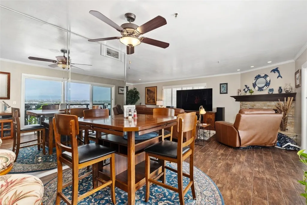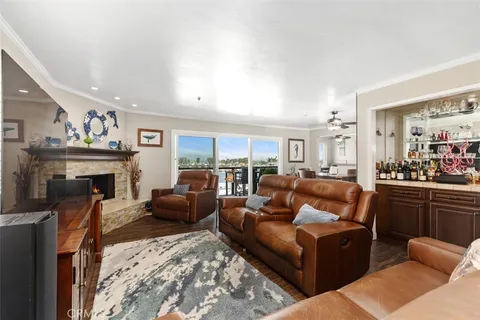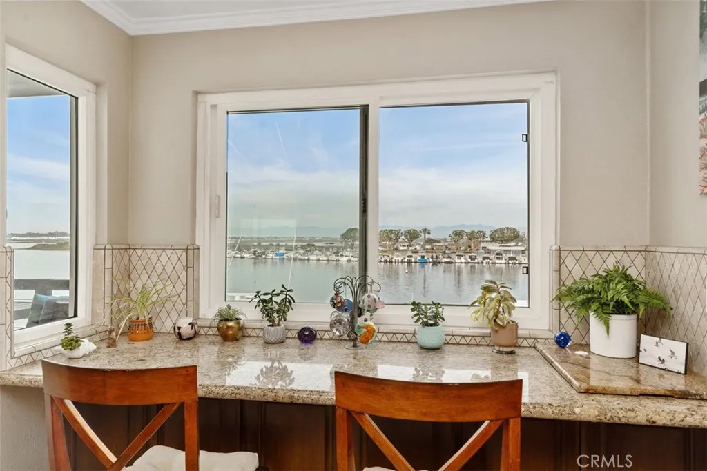 Experience waterfront living with stunning panoramic views in this single-level Bayport condo, offering one of the best views in Huntington Harbour showcasing the extra wide main channel, wetlands, and snow-capped mountains. This home is ideally situated next to the newly renovated Peter's Landing offering a wide variety of waterfront dining and shopping options and just moments from the serene sands of Sunset Beach, both of which offer a plethora of water activities including boat docks available for rent in the Peter's Landing Marina. The home's floor plan includes three bedrooms, with one currently configured as an open den with harbor views and sliding barn doors for guests that can easily be converted back to a third bedroom, along with three bathrooms. The spacious primary suite features dual bathrooms and a large walk-in closet. The kitchen, breakfast nook, dining room and living room all enjoy wide water views, and the living area opens to the recently renovated waterfront balcony. Additional features include a living room fireplace and wet bar, a laundry room with a second refrigerator, and a wine fridge. Located in the gated Bayport community, residents enjoy private building and elevator access and a variety of amenities including a harbor-front clubhouse, heated pool and spa, barbecue area, and pickleball / tennis court. This home is the perfect place to watch the holiday boat parade or simply enjoy your daily cup of coffee while admiring the serenity of waterfront living. You may even spot a dolphin or sea lion swimming by!