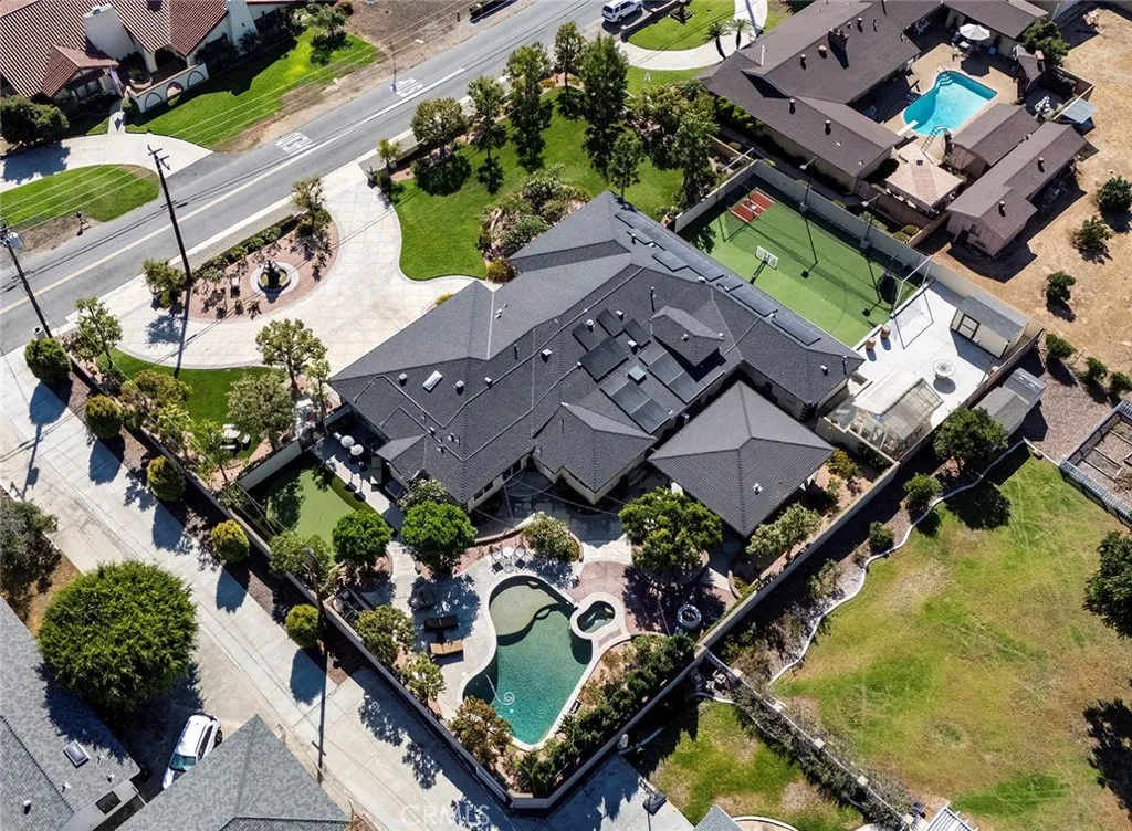 Nestled on a sprawling 29,873-square-foot lot, this meticulously remodeled single-level estate radiates sophistication and refined luxury, with no detail spared. From the moment you arrive, the home s striking curb appeal, highlighted by a grand circular driveway and pristine landscaping, sets the tone for what lies beyond. Inside, you'll discover an expansive 4,072-square-foot layout featuring five bedrooms and four bathrooms, designed for both grand entertaining and relaxed living. The kitchen is both open to the dining room and living area, complete with beamed ceilings and plenty of windows, letting in plenty of natural light. With space to comfortably host over 150 guests, this home is ideal for those who love to entertain on a large scale. The freshly painted interiors boast a seamless blend of modern upgrades, including new luxury wood flooring, custom cabinetry, and quartzite countertops throughout. High-end finishes such as plantation shutters, designer ceiling fans, solid core doors, and updated hardware elevate the home's elegance. The heart of the home, the gourmet kitchen, is a chef s dream, outfitted with Thermador appliances, a plumbed electric cooktop (ready for gas), a farmhouse sink, a pot filler, under-cabinet plugs in the island and buffet, two water filtration systems, and an expansive butler's walk-in pantry. Designed for ultimate outdoor living, the resort-style backyard offers a PebbleTec pool and spa, a built-in BBQ, a large patio with dual gas heaters, a firepit, a greenhouse, a sports court, a batting cage, a putting green, and a lush collection of over 50 plumeria plants. This private oasis is perfect for relaxation or hosting memorable gatherings. The opulent primary suite features vaulted ceilings, a cozy retreat area, an oversized custom closet, and a spa-like en suite bathroom with a soaking tub. Additional highlights include a three-car garage with epoxy floors, built-in cabinets, and rafter storage, as well as a security system, two newer air conditioners, a recently replaced roof, two whole-house fans, new solar panels and a newer water heater. Situated with no Mello Roos or HOA fees, this extraordinary home offers both luxury and convenience in one of the area s most sought-after locations.