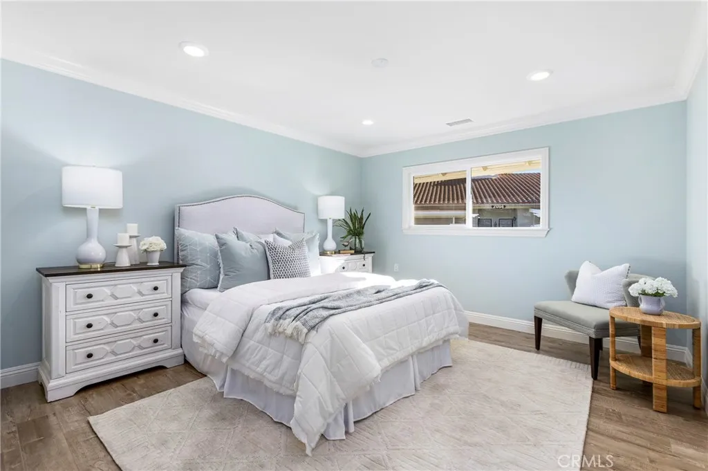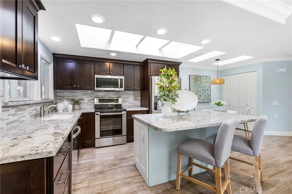 Discover the perfect blend of comfort & convenience in this beautifully updated 2-bedroom, 2-bathroom single-level Casa Linda home, thoughtfully designed for relaxed, low-maintenance living, completely remodeled in 2017. No stairs & no neighbors above or below w/only one common wall, & carport parking just steps away. This home is ideal for those seeking a peaceful & accessible home. 6 stunning architectural skylights fill the home w/natural light & create a bright, airy space. Contemporary updates offer a modern touch, while the in-unit stacked washer/dryer provide everyday ease & independence. The Kitchen is a jewel w/granite countertop, custom tile backsplash, recessed lighting, stainless steel appliances-range, microwave, refrigerator, dishwasher & microwave, upgraded warm wood cabinetry & an elegant white wood & granite island. The walk-in pantry offers tons of storage. The dining nook is adorable w/lovely woven basket lighting & extra storage closet nearby. Conveniently Located between Gate 5 & 6 you have easy access to the 5 freeway or all the shops & amenities nearby. This End Unit is an amazing location w/pretty views of the grassy areas & trees from all your windows & your private patio, all located on a lovely greenbelt w/peaceful pathways. Just a few of the thoughtful upgrades to this home include custom decorator paint, newer 2 solar tubes, recessed lighting, dual pane windows and sliders, smooth ceilings, granite counters and custom backsplash, newer cabinets, newer HVAC, 6 Massive Skylights, wood-like laminate flooring with extra deep moldings & baseboards, Italian Style hand-textured walls, electric fireplace w/stacked stone tile surround, custom lighted built-ins, bright & sunny patio accented w/travertine stone tile set in an elegant Versailles pattern & so much more! Whether you're looking to downsize, simplify, or just enjoy the ease of move-in ready living, this private, serene condo is a rare gem. Amenities include: 7 club houses; 5 pools; 4 hot tubs;814-seat Performing Arts Center; 27-hole golf course, a driving range plus a 19-hole par 3 Executive Course with club house and restaurant; equestrian center; lit tennis and pickle ball courts; volleyball; bocce ball; basketball; shuffle board; badminton; indoor archery range; yoga; tai chi; billiards; line dancing; 3 fitness centers; 2 computer centers; card room; video lab; digital photography studio; wood shop; sewing room; 2 ceramic studios; art room; jewelry making and more.