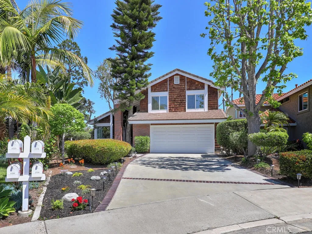 Tucked away at the end of a peaceful single-loaded cul-de-sac in South Mission Viejo, this inviting home offers a perfect blend of comfort, style, and privacy. With 3 bedrooms, 2.5 baths, and a versatile office nook at the top of the stairs, the floor plan is both functional and flexible. The entry level features a spacious living room with a charming window seat that frames serene views of mature trees and the greenbelt across the street. Steps down lead to a formal dining room and casual living space, where the white kitchen opens to a cozy family room complete with built-in bookshelves and a brick fireplace. The kitchen features updated cabinetry, granite countertops, a pantry, and a breakfast nook with seating beside a sunny bay window. A large kitchen sink looks out to the sparkling pool and spa and lush backyard views. Laminate wood flooring runs throughout the downstairs living areas, complemented by neutral decor and abundant natural light. Most of the windows have been updated, adding to the home's energy efficiency and modern feel. Upstairs, the primary suite offers a private retreat with its own brick fireplace, a walk-in closet plus an additional closet, and a large en-suite bath with a double sink vanity. A small private balcony off the primary suite provides expansive, panoramic views. The backyard includes a pool, patio, and large side yard ideal for gardening. No homes directly behind. Long driveway, garage with storage, full repipe. Includes Lake Mission Viejo membership with beaches, boating, concerts, camps and more.