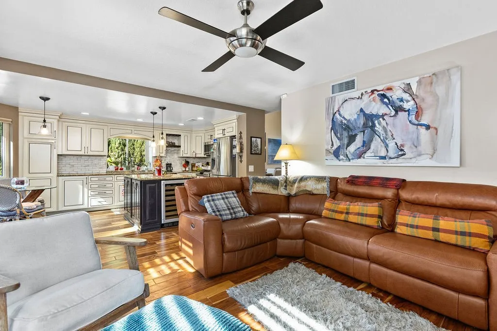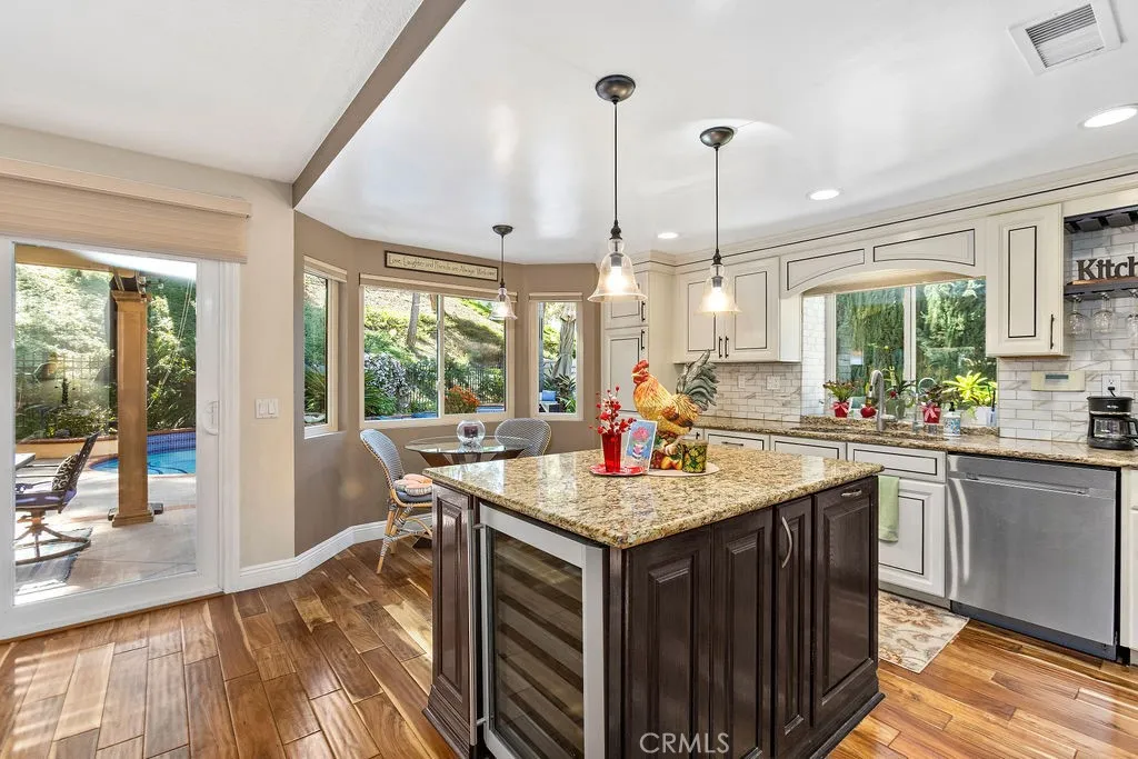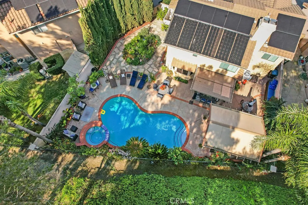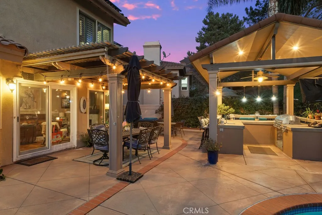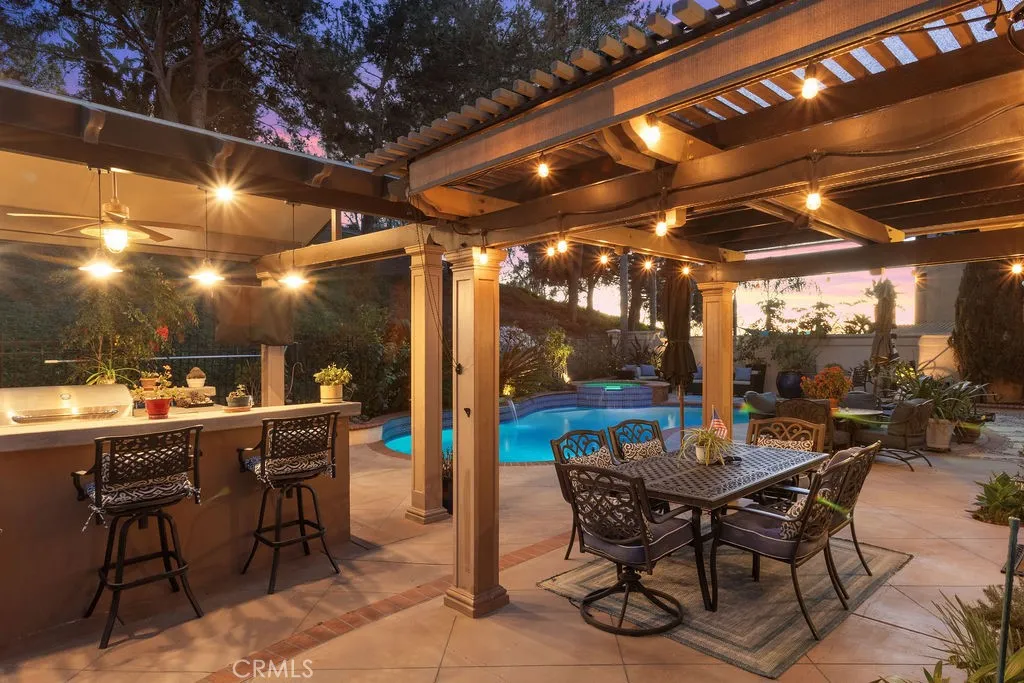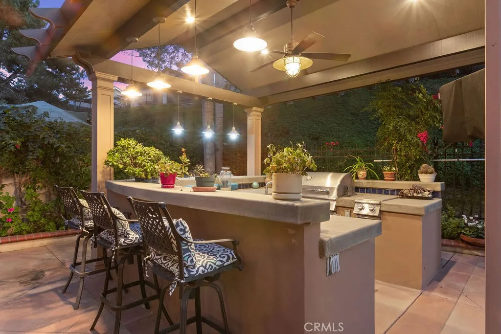 Incredible opportunity for this 3-bedroom, 2.5-bath pool home tucked away at the end of a quiet cul-de-sac in the highly sought-after Bel Air community of Mission Viejo. Upon entering the home the formal living room flows seamlessly into the dining area and onward to the beautifully remodeled kitchen, featuring upgraded custom cabinetry, soft-close drawers, granite countertops, a large center island with built-in wine chiller, high-end Samsung appliances, and a sunny dining nook overlooking the spectacular backyard and pool. The kitchen opens directly to the family room with a fireplace and serene views of the pool and spa. The primary suite is a true retreat, offering a spa-like bathroom with a travertine-lined walk-in shower and bench, granite counters, dual vanities with soft-close drawers, designer lighting, framed mirrors, and a walk-in closet with sleek opaque silhouette glass sliding doors. Both the hallway and downstairs bathrooms have also been upgraded. Designed for indoor-outdoor living, the resort-style backyard is truly an entertainer's dream. The covered outdoor kitchen is complete with bar seating, a premium five-burner Bull BBQ with two side burners, Flame outdoor refrigerator, and hot/cold water sink. The sparkling pool and attached spa have newer Pentair pool equipment, all conveniently controlled via a phone app--along with outdoor lighting and music in both the front and back yards. Additional highlights include solar system (owned)for both house and pool (our sellers heated pool April thru October & with AC in summer had an electricity cost of approximately $400 over 12 months!), newer dual pane windows throughout, plantation shutters and newer AC and furnace. The oversized 2-car attached garage includes cabinetry. shelving and epoxy floors. As an added bonus, the home includes membership to Lake Mission Viejo, offering boating, fishing, beach access, concerts, and an unforgettable Fourth of July fireworks show.