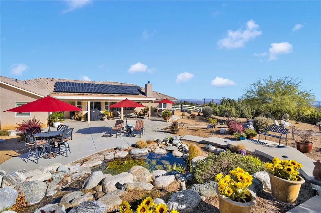 Exquisite Pinon Hills Oasis on Paved Road - A Rare Offering! Experience luxury desert living in this one-of-a-kind Pinon Hills estate, perfectly situated on a paved road and spanning 2.5 acres of pristine, usable land. Meticulously maintained by its original owner, this immaculate residence radiates pride of ownership and truly shows like new. Equestrian and hobby enthusiasts will appreciate the well-appointed horse arena and barn, adding to the estate's rare versatility and appeal. Step inside to discover a refined interior featuring three spacious bedrooms, two elegant bathrooms, a formal dining room, and a generously sized indoor laundry room. Designed for both comfort and style, the home offers seamless flow and exceptional attention to detail throughout. The three-car garage provides ample storage and convenience, while the expansive grounds redefine outdoor living. The professionally landscaped backyard is a private sanctuary - complete with a tranquil waterfall and koi pond, lush greenery, and a large covered patio ideal for entertaining. From here, take in the breathtaking desert sunsets that make this property truly unforgettable. The generously sized solar system helps to keep the electric costs down year around. Located just moments from Highway 138 for an effortless commute and a short drive to Mountain High Ski Resort, this residence offers the perfect balance of serenity and accessibility. A property of this caliber is seldom available - this is your opportunity to own a private desert retreat where sophistication meets natural beauty.