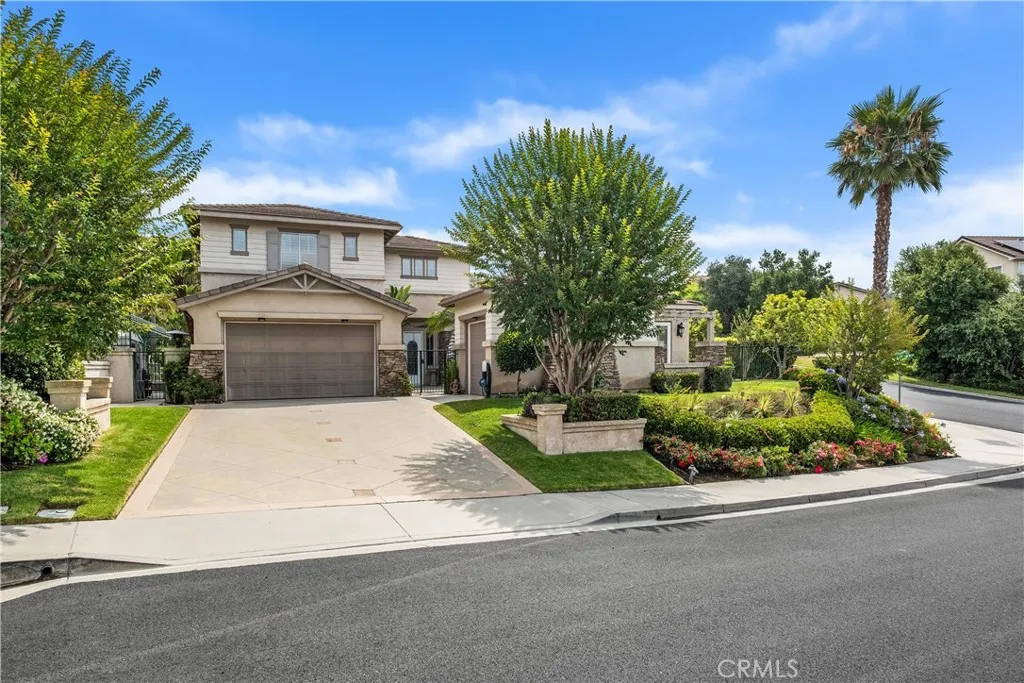 Elegant Santiago Canyon Estates | Spacious, Stylish, and Designed to Impress. Tucked away on a quiet single-loaded street in one of Santiago Canyon's most desirable neighborhoods, this 5-bedroom, 4-bathroom stunner sits on an expansive 16,437 sq ft corner lot, offering over 3,300 sq ft of luxurious living space and a 3-car finished garage. A gated courtyard with stamped concrete sets the stage for a grand entrance. Step inside to soaring ceilings, oversized crown molding, plantation shutters, tall baseboards, and beautifully tiled floors that flow throughout the main level. The layout is as functional as it is elegant. The main floor with no interior steps features the spacious primary suite, two additional bedrooms, three full bathrooms, a formal living and dining room, a hall study nook, and a full laundry room. The heart of the home - a generous great room with built-in entertainment center - opens to a chef's kitchen with island, walk-in pantry, built-in desk, and stainless-steel appliances. Upstairs, you'll find two more spacious bedrooms, an adjoining full bath, and a second hall study area - ideal for homework zones, creative space, or additional work-from-home needs. Step into your private backyard retreat complete with a built-in BBQ bar, sparkling pool and spa, sundeck, lush lawn, and mature greenery - perfect for entertaining or relaxing under the Orange County sun. This is more than a home - it's a lifestyle. Welcome to your dream address in Santiago Canyon Estates.