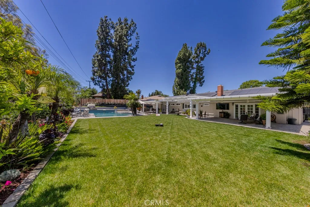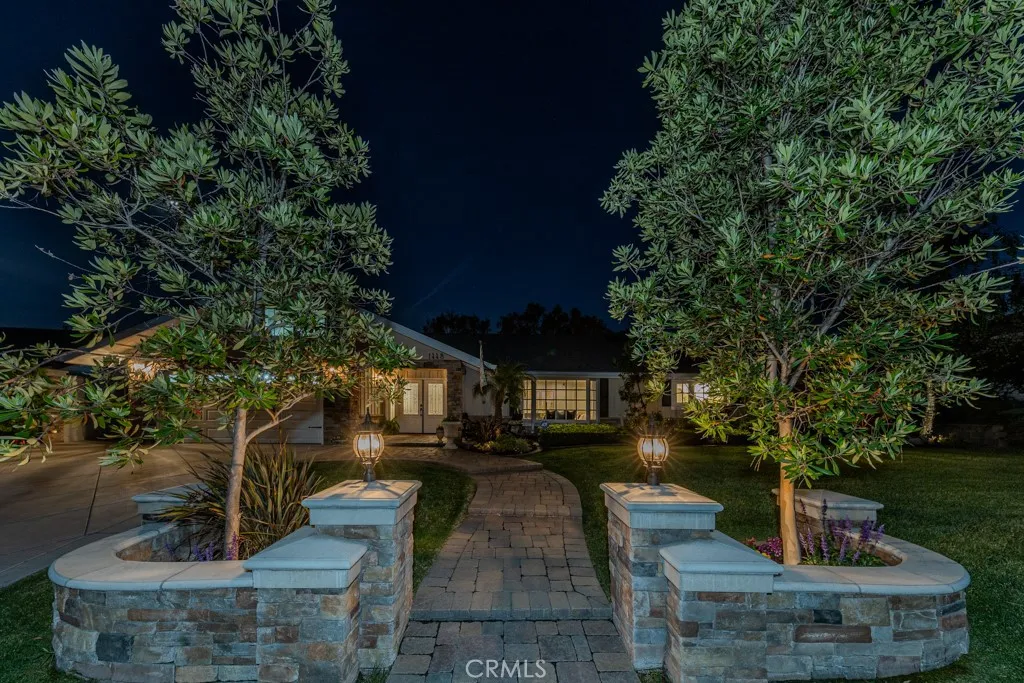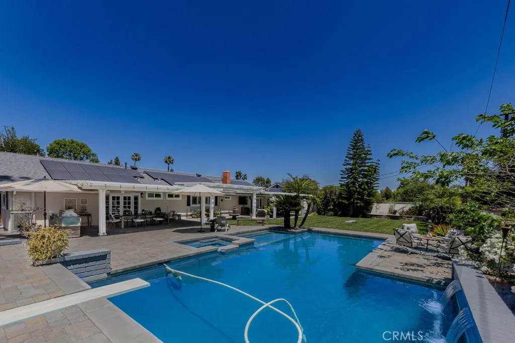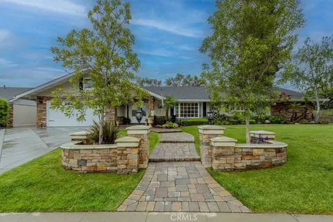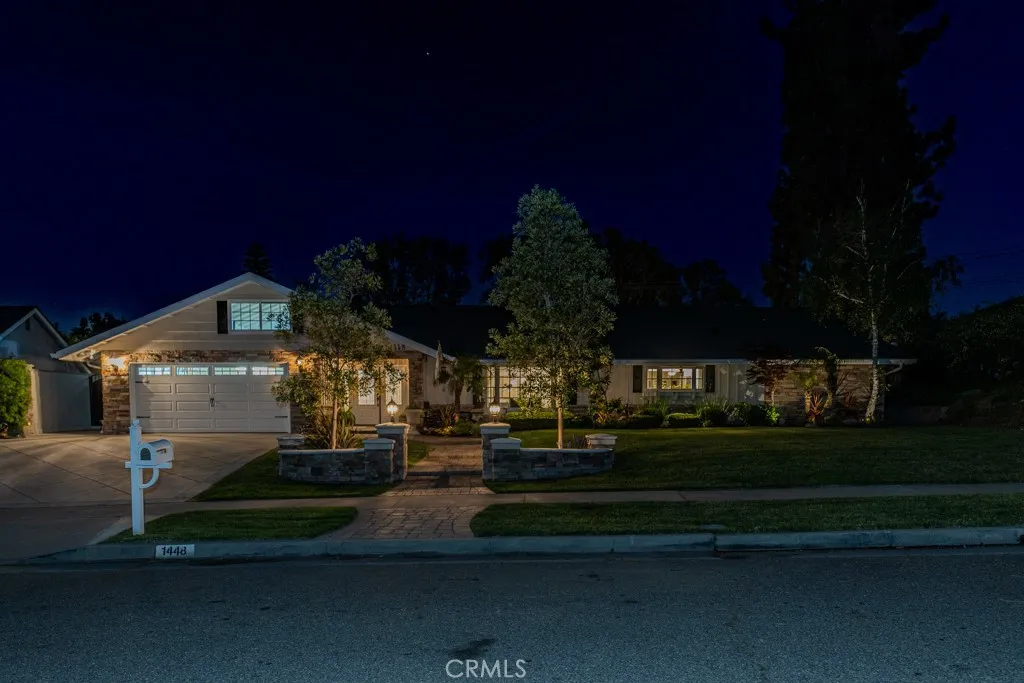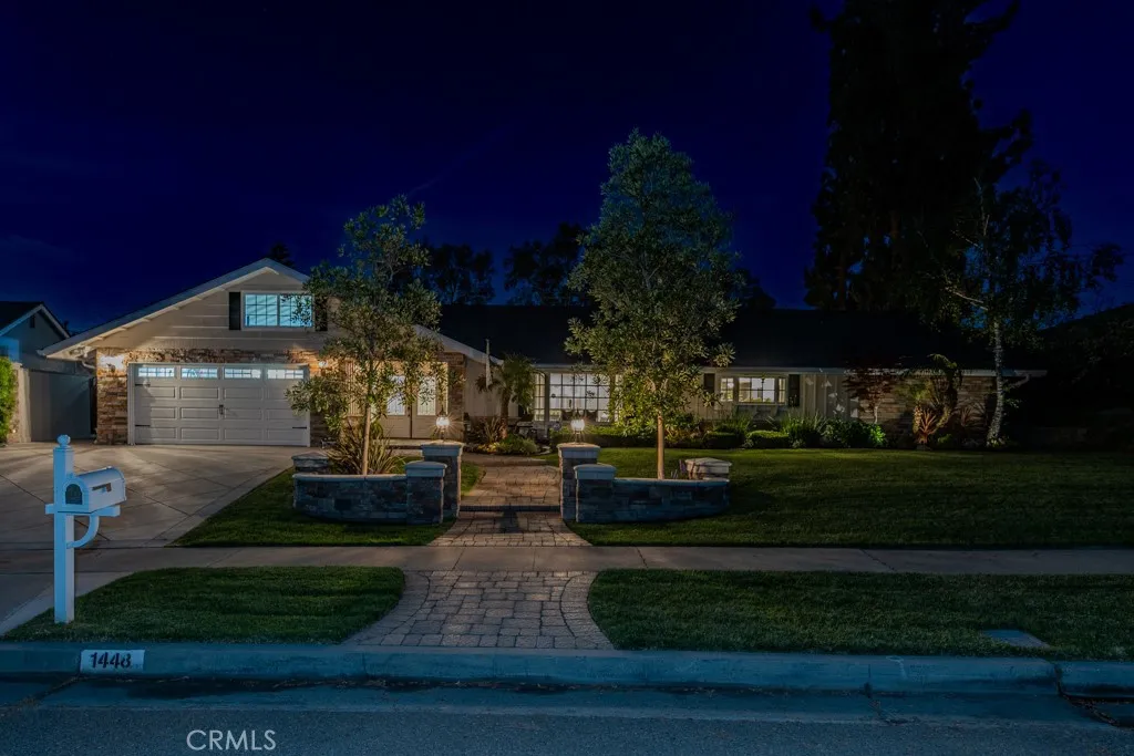 Welcome to 1448 W Domingo Rd in Fullerton, a beautifully upgraded single-story home in the highly desirable Sunny Hills neighborhood. This home sits on a private lot just under half an acre, offering space, comfort, and incredible outdoor living. From the moment you arrive, you're welcomed by paver walkways, a double-door entry, and charming stacked stone accents. Inside is a foyer that opens to a spacious living room with a large bay window providing great natural lighting, wood flooring, and recessed lighting. The kitchen is tastefully updated with granite counters, an island, stainless steel appliances, upgraded cabinetry, recessed lights, a bay window, and a pantry. The dining area has a ceiling fan and French doors with operable side panels opening to the backyard. To the left of the entry, the large family room has a brick fireplace, recessed lighting, and another set of French doors with side windows that open, creating great indoor-outdoor flow. The covered patio is an entertainer's dream. Both ends of the patio feature recessed lights and dual ceiling fans. It's wired for a wall-mounted TV and set up for outdoor entertaining. The stainless steel barbecue can connect to a gas line and sits near the paver-lined entertaining area. The pool and spa include a diving board and multiple waterfalls that flow into the pool. The spacious yard also includes a large grass area and is surrounded by mature trees for enhanced privacy and relaxation. All bedrooms and living spaces have wood flooring, while the kitchen, bathrooms, and dining area feature large tile flooring. The primary bedroom has double-door entry, a walk-in closet, plantation shutters, and a ceiling fan. The remodeled bathroom features granite counters, custom cabinetry, recessed lights, and a walk-in tiled shower. The guest bathroom has dual sinks, custom cabinetry, and a tiled shower combo. Not included in the square footage is an upstairs bonus area with an office nook and open media space. The finished two-car garage has direct access and epoxy flooring. A wide driveway provides room for multiple cars. All windows have been replaced, solar with 33 panels is paid off, the electrical panels have been updated, and the home is in excellent condition. Zoned for some of Fullerton's top-rated schools including Laguna Rd and Sunny Hills, this location is ideal for anyone seeking access to top-tier education. Rare chance to own this beautiful home in one of the best neighborhoods in the city.