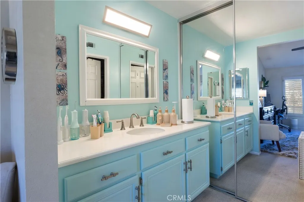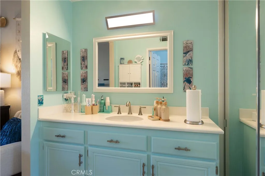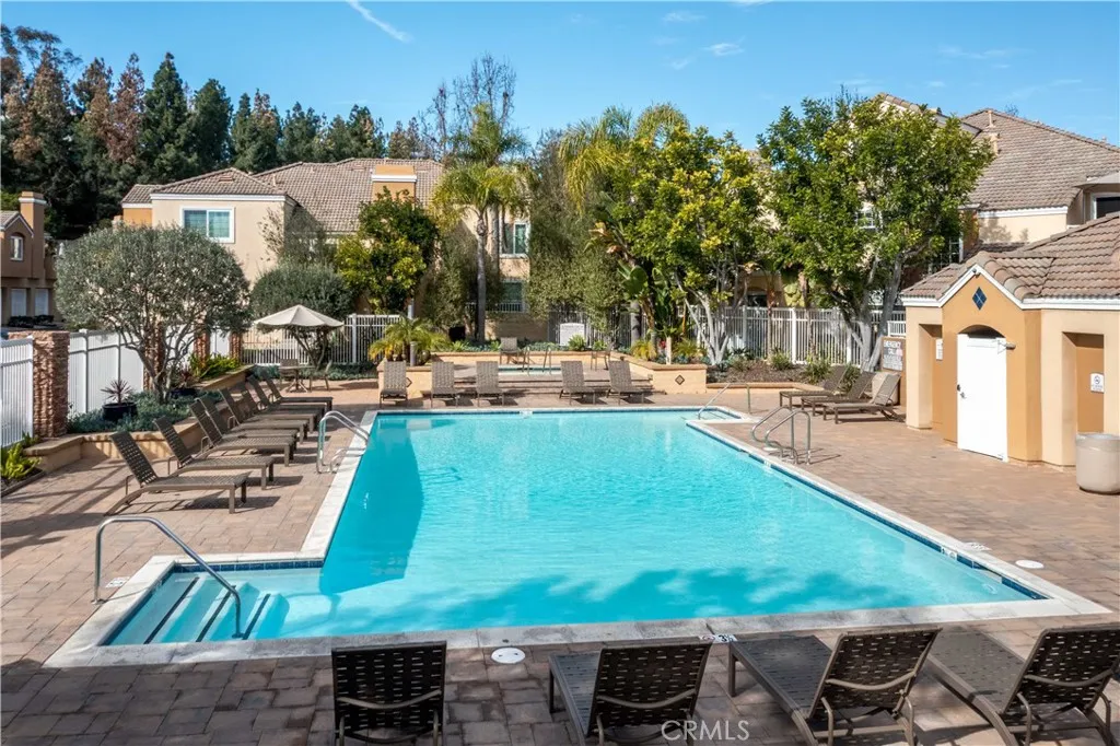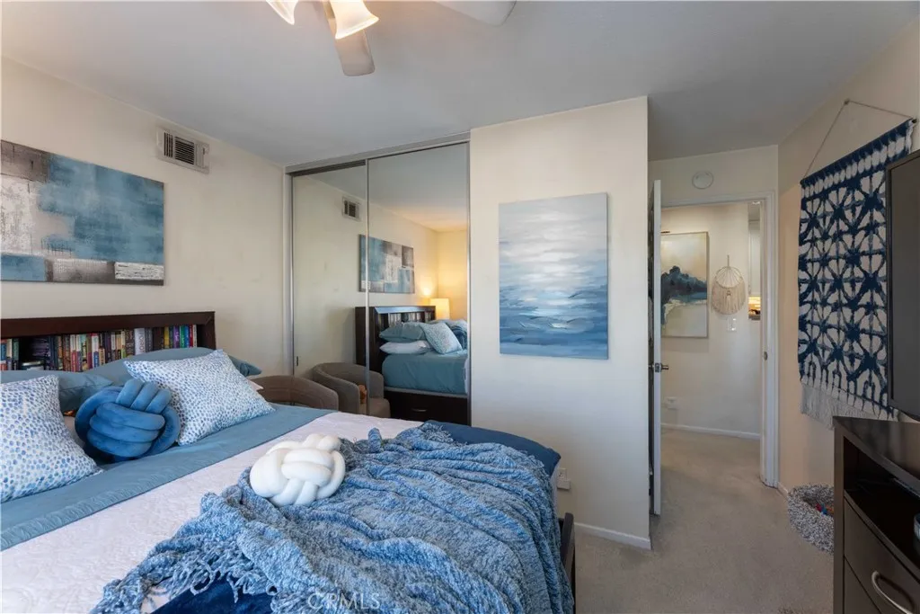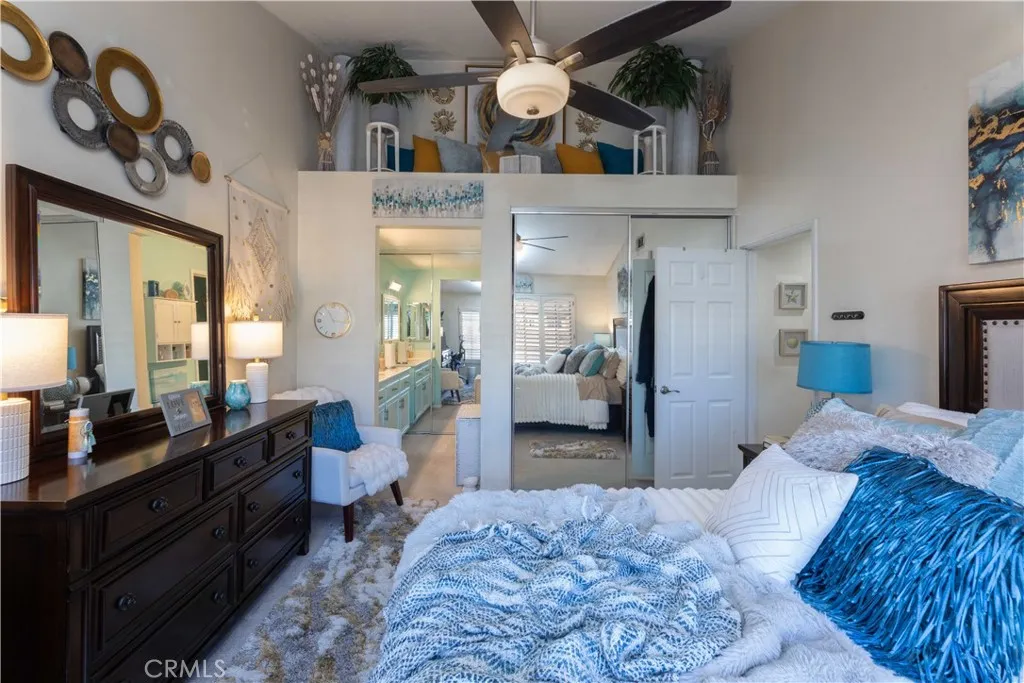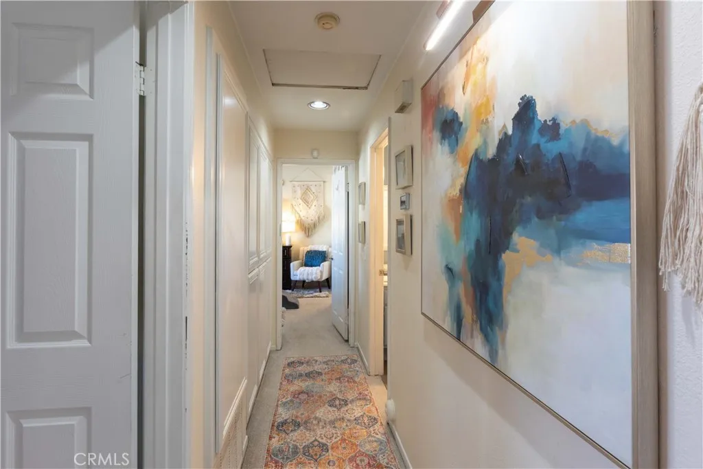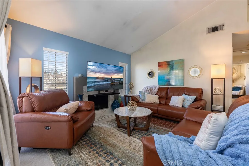 There's a quiet sense of ease the moment you arrive - a feeling of being gently set apart from the outside world. This thoughtfully designed home welcomes you through a private entry foyer, offering a natural transition before you ascend to the main living level. With all primary living spaces thoughtfully positioned upstairs, the home enjoys a peaceful, elevated feel - removed from street activity & grounded in light, openness, & calm. Once upstairs, vaulted ceilings soar above the main living areas, enhancing the airy, light-filled layout. Dual-pane windows with decorative grids & plantation shutters allow sunlight to filter in beautifully, while designer carpet & linen-style porcelain tile add warmth & texture underfoot. The living room centers around a marble tile inset gas fireplace, complemented by a pull-down TV mount that blends form & function. The home's relaxed & balanced atmosphere is reinforced by the air conditioning & powerful three-blade ceiling fan in the spacious dining room. The kitchen is both refined & practical, featuring crisp white cabinetry with soft-close drawers, pull-out drawers, a spice cabinet, a large closet-size pantry, under-cabinet lighting, recessed lighting, & a silverware organizer. Granite countertops, stainless steel appliances, & ample prep space make it ideal for a gourmet chef, entertaining, & everyday living. The primary suite offers a calming retreat with vaulted ceilings, mirrored wardrobe doors, custom closet organizers, & additional storage above the closets. The en-suite bathroom features generous counter space & linen storage, a 2nd closet, a LUXE bidet, & clean, coastal-inspired finishes. A secondary bedroom provides flexibility for guests, a home office, or creative space & includes a ceiling fan, closet organizer & mirrored wardrobe doors, while the nearby bathroom features a second LUXE bidet & coordinated finishes. Step outside to the private south-west facing balcony - a sunlit extension of the living space that's perfect for morning coffee, evening relaxation, or quiet reflection. The outdoor space feels open yet private, enhanced by the home's elevated orientation. Additional highlights include 6-panel doors, an attic fan, PEX repipe, saltwater softener system, reverse osmosis at kitchen sink, & one-car enclosed garage with direct access - offering both convenience & versatility. Residents enjoy access to a community pool & spa, & is located near shopping, dining, parks, award-winning schools, & restaurants.